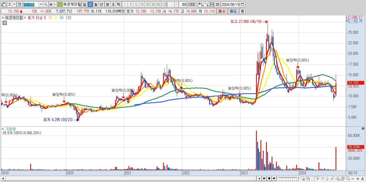 - 애경케미칼 (13,150원 ▲ 29.56% , 시총: 6,397억, 거래량: 39,974,338, 거래대금:5,463억)