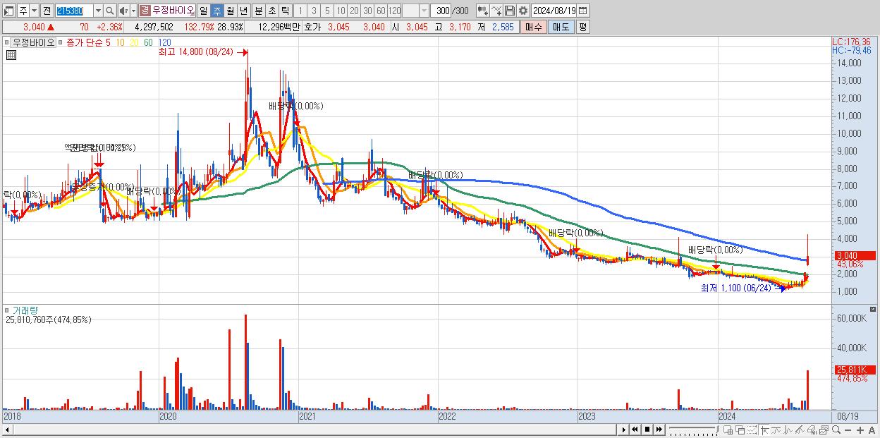 - 우정바이오 (3,040원 ▲ 43.06% , 시총: 452억, 거래량: 25,810,760, 거래대금:863억)