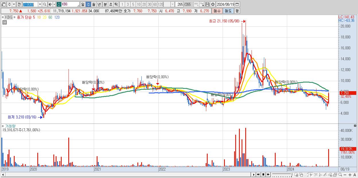 - KBG (7,750원 ▲ 32.48% , 시총: 677억, 거래량: 19,316,671, 거래대금:1,419억)
