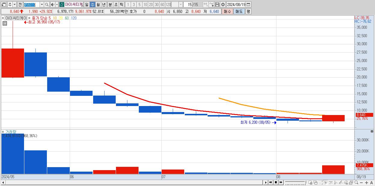 - 아이씨티케이 (8,640원 ▲ 25.76% , 시총: 1,142억, 거래량: 7,474,913, 거래대금:596억)