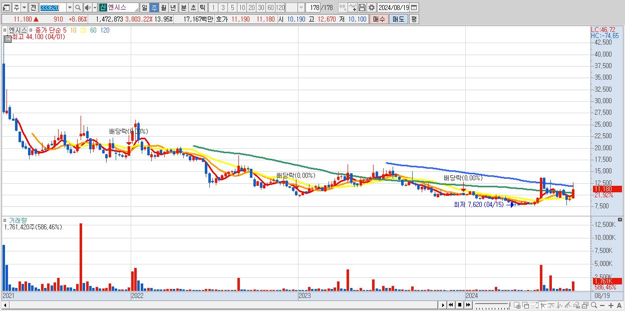 - 엔시스 (11,180원 ▲ 21.92% , 시총: 1,180억, 거래량: 1,761,420, 거래대금:201억)