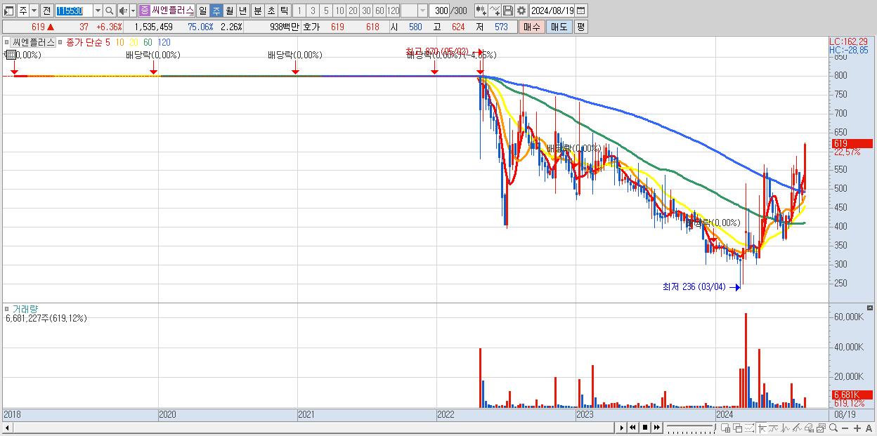 - 씨엔플러스 (619원 ▲ 22.57% , 시총: 421억, 거래량: 6,681,227, 거래대금:39억)