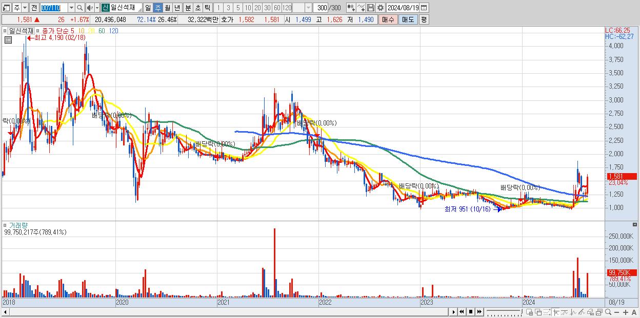 - 일신석재 (1,581원 ▲ 23.04% , 시총: 1,225억, 거래량: 99,750,217, 거래대금:1,486억)