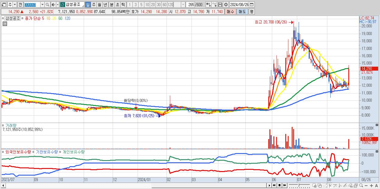 - 삼성공조 (14,290원 ▲ 21.82% , 시총: 1,161억, 거래량: 7,121,950, 거래대금:989억)
