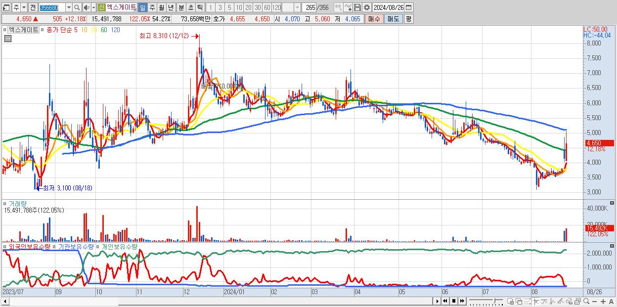 - 엑스게이트 (4,650원 ▲ 12.18% , 시총: 1,327억, 거래량: 15,491,788, 거래대금:737억)