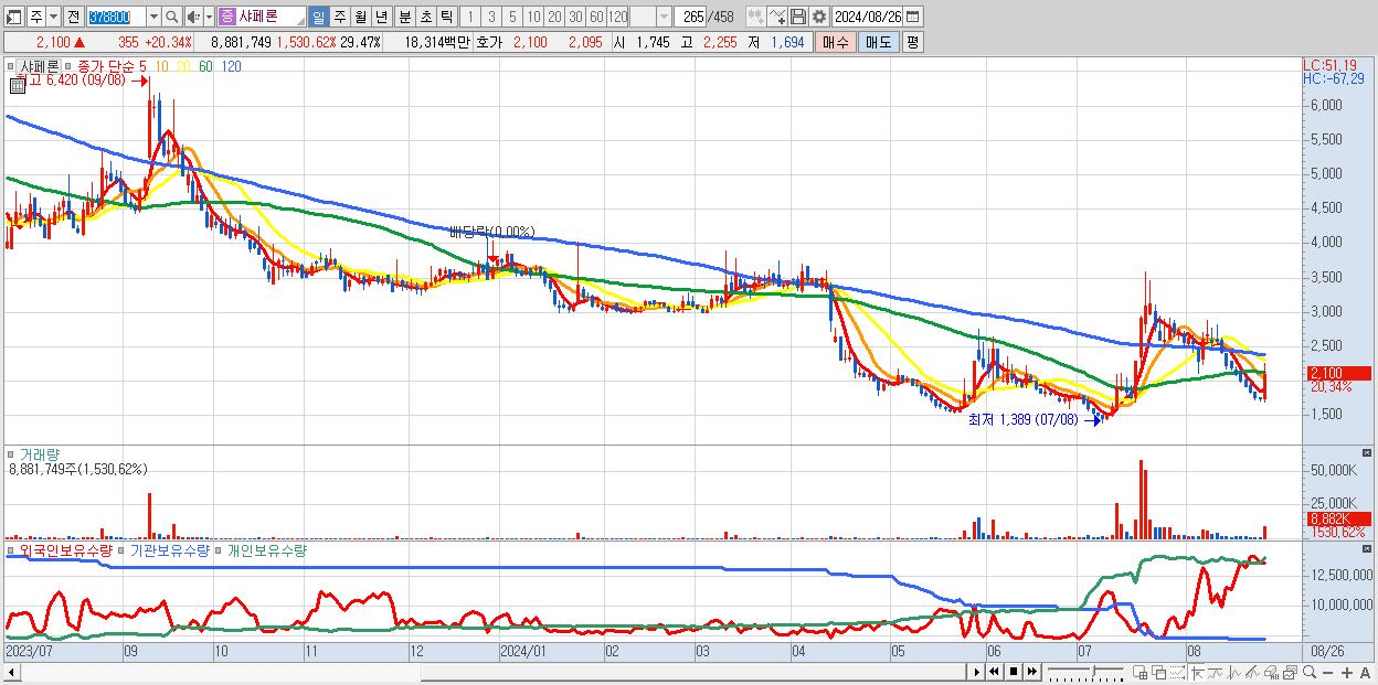 - 샤페론 (2,100원 ▲ 20.34% , 시총: 633억, 거래량: 8,881,749, 거래대금:183억)