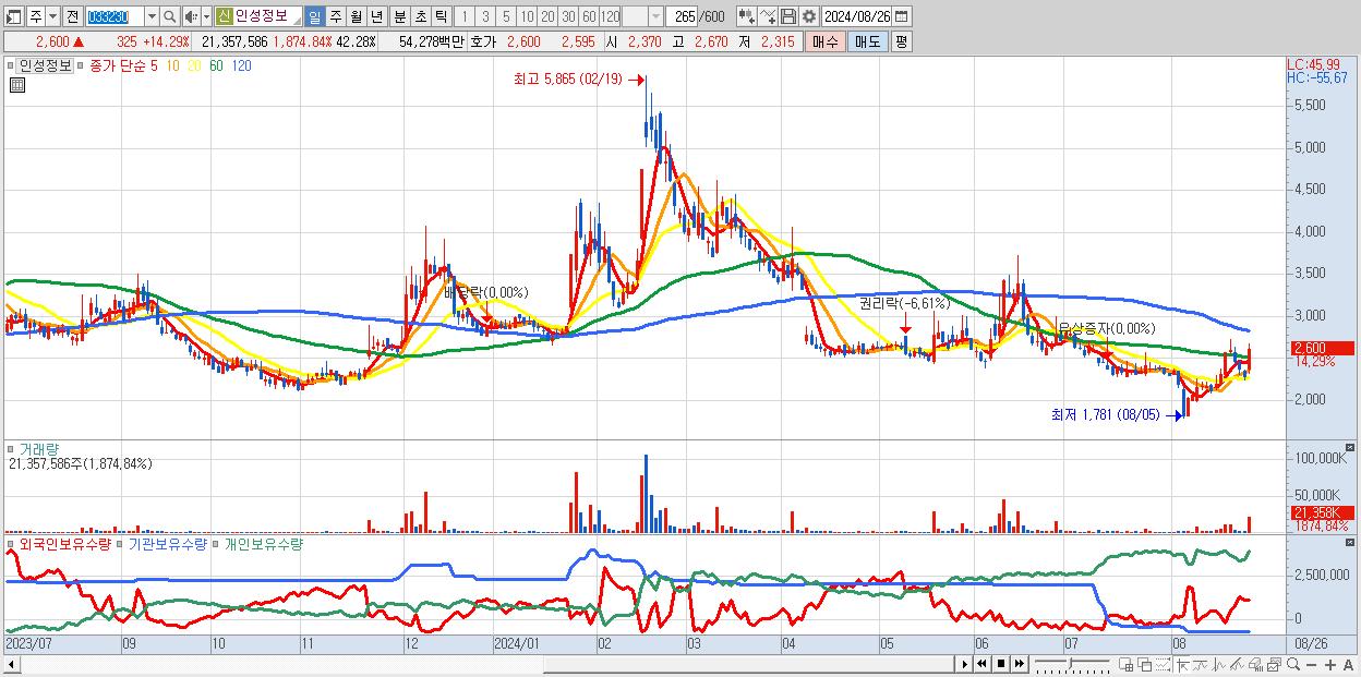 - 인성정보 (2,600원 ▲ 14.29% , 시총: 1,313억, 거래량: 21,357,586, 거래대금:543억)