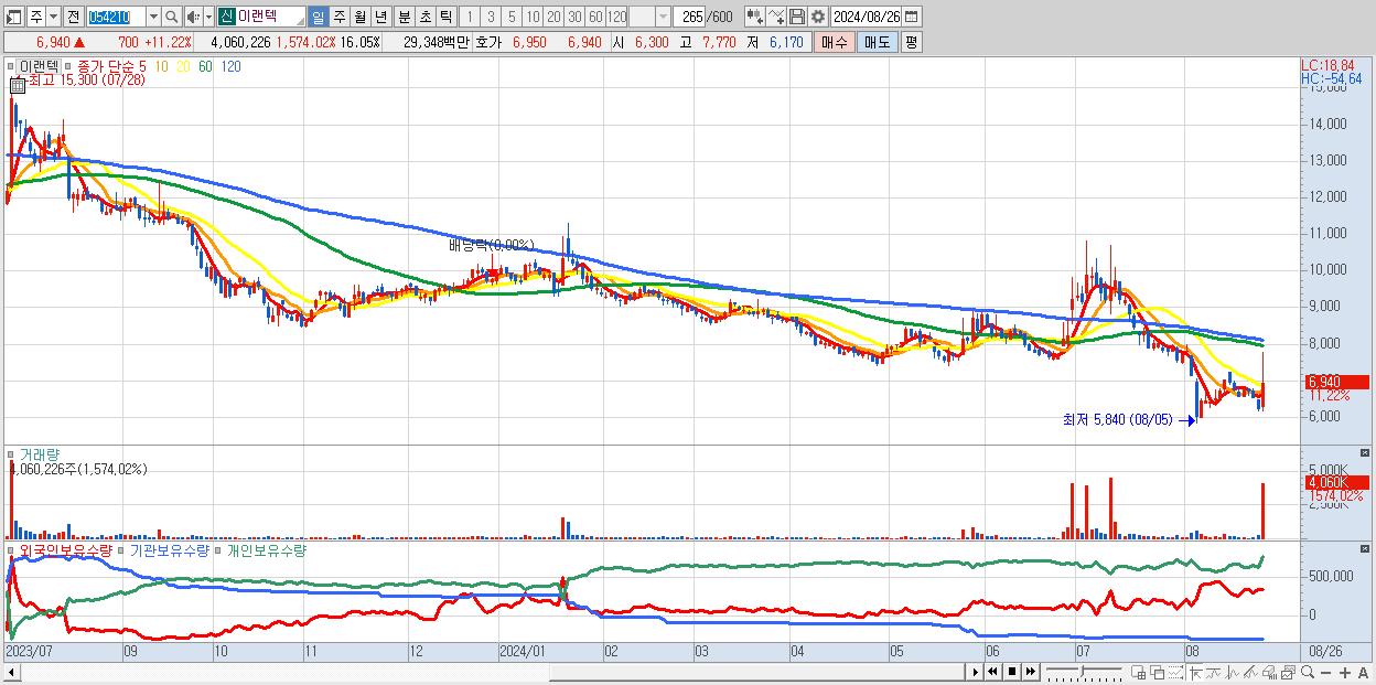 - 이랜텍 (6,940원 ▲ 11.22% , 시총: 1,755억, 거래량: 4,060,226, 거래대금:293억)