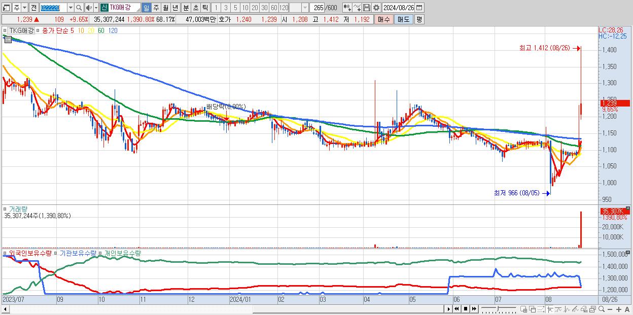 - TKG애강 (1,239원 ▲ 9.65% , 시총: 642억, 거래량: 35,307,244, 거래대금:470억)