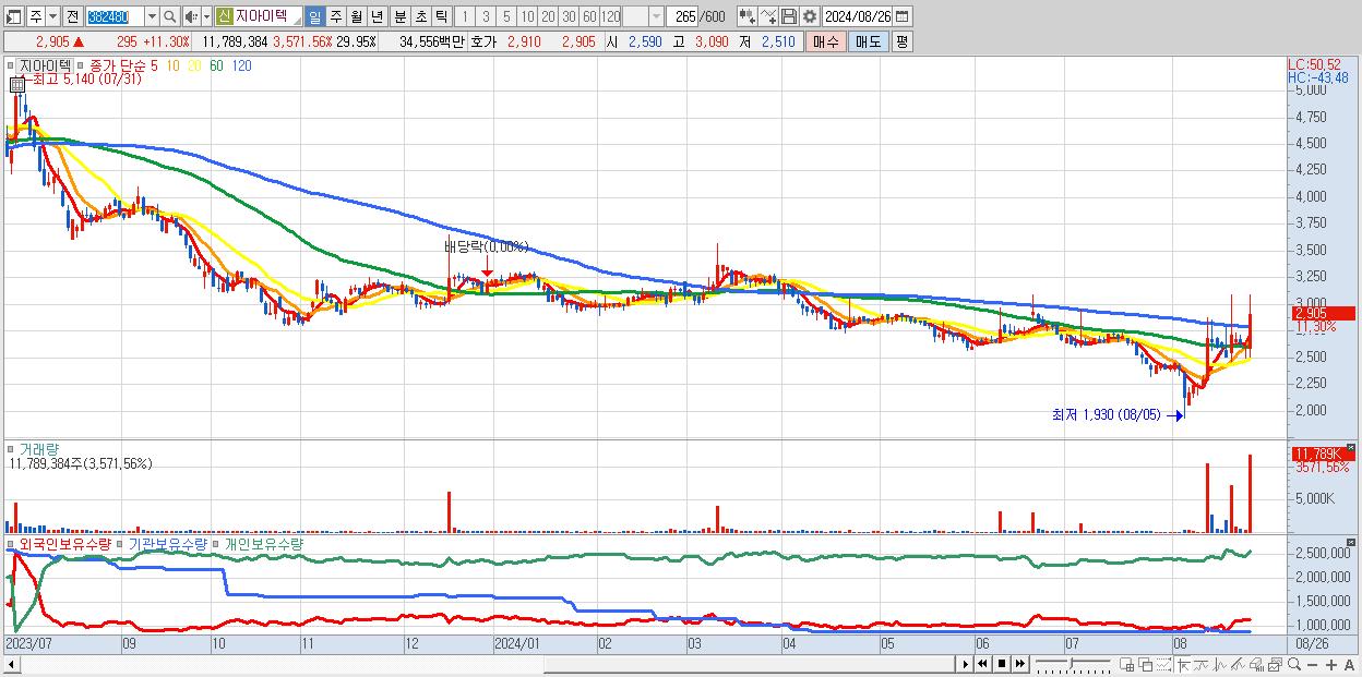 - 지아이텍 (2,905원 ▲ 11.3% , 시총: 1,143억, 거래량: 11,789,384, 거래대금:346억)