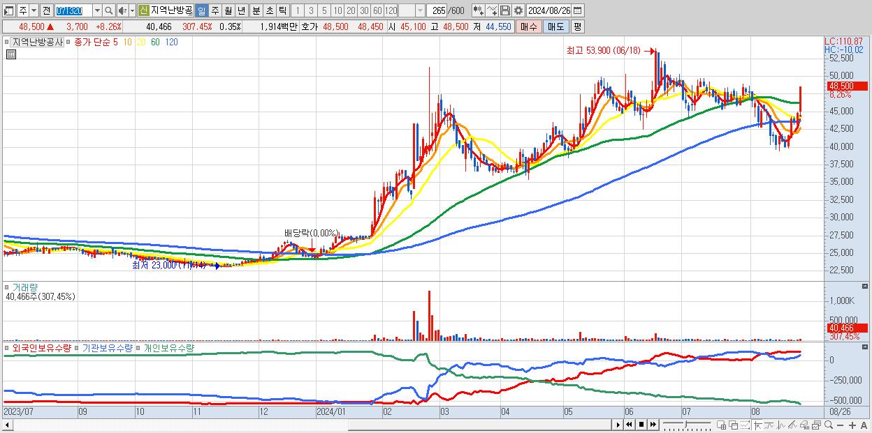 - 지역난방공사 (48,500원 ▲ 8.26% , 시총: 5,616억, 거래량: 40,466, 거래대금:19억)