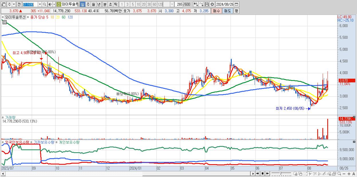 - 와이투솔루션 (3,670원 ▲ 11.04% , 시총: 1,342억, 거래량: 14,778,290, 거래대금:568억)