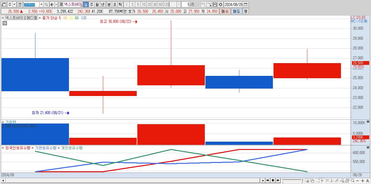 - 넥스트바이오메디컬 (26,500원 ▲ 10.65% , 시총: 2,122억, 거래량: 3,299,422, 거래대금:877억)