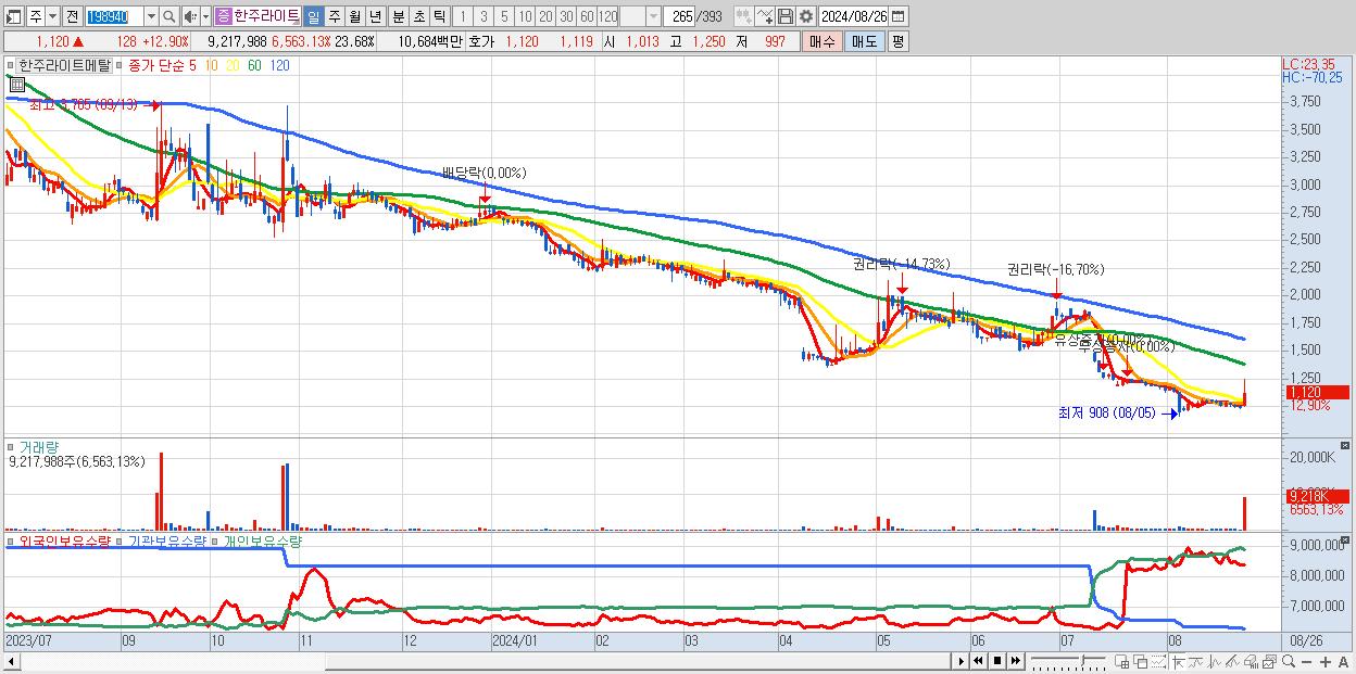 - 한주라이트메탈 (1,120원 ▲ 12.9% , 시총: 436억, 거래량: 9,217,988, 거래대금:107억)
