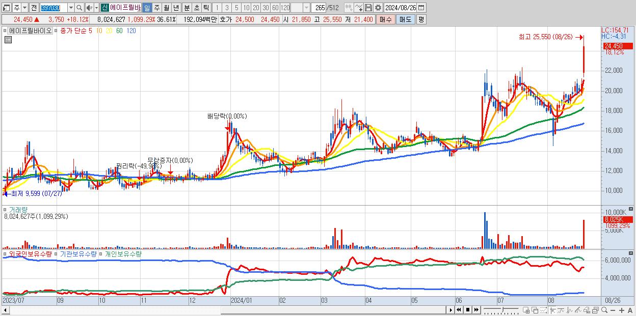 - 에이프릴바이오 (24,450원 ▲ 18.12% , 시총: 5,359억, 거래량: 8,024,627, 거래대금:1,921억)