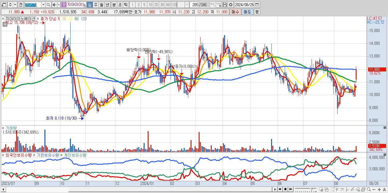 - 지아이이노베이션 (11,980원 ▲ 10.62% , 시총: 5,297억, 거래량: 1,518,935, 거래대금:177억)