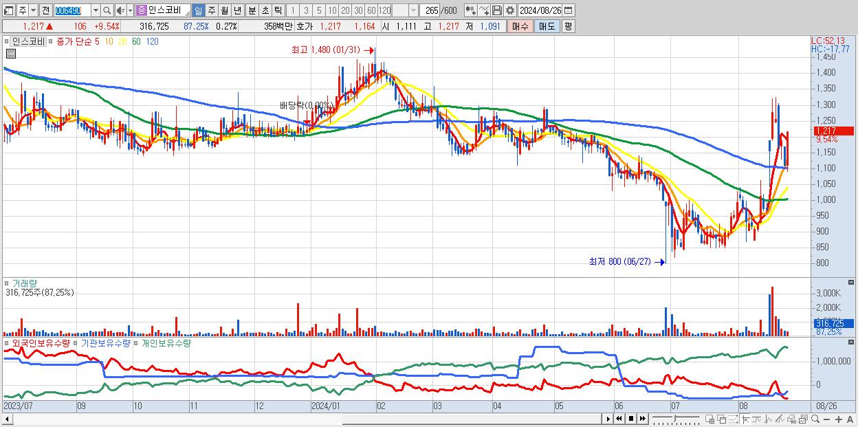 - 인스코비 (1,217원 ▲ 9.54% , 시총: 1,453억, 거래량: 316,725, 거래대금:4억)