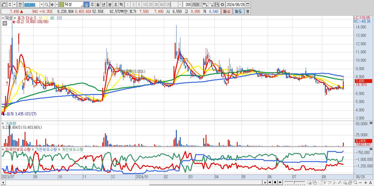 - 덕성 (7,490원 ▲ 14.35% , 시총: 1,174억, 거래량: 8,239,904, 거래대금:626억)