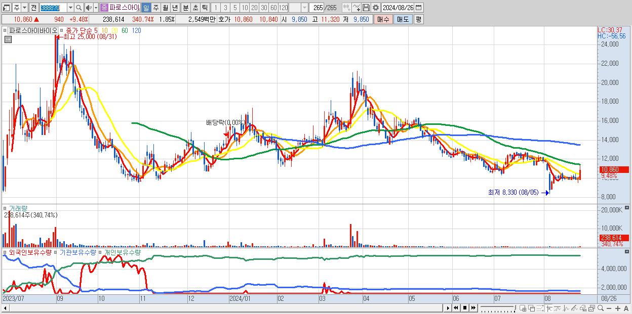 - 파로스아이바이오 (10,860원 ▲ 9.48% , 시총: 1,403억, 거래량: 238,614, 거래대금:25억)