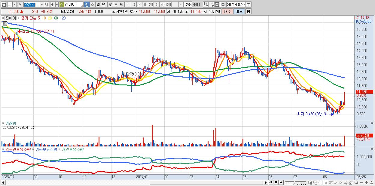 - 진에어 (11,080원 ▲ 8.95% , 시총: 5,784억, 거래량: 537,329, 거래대금:58억)