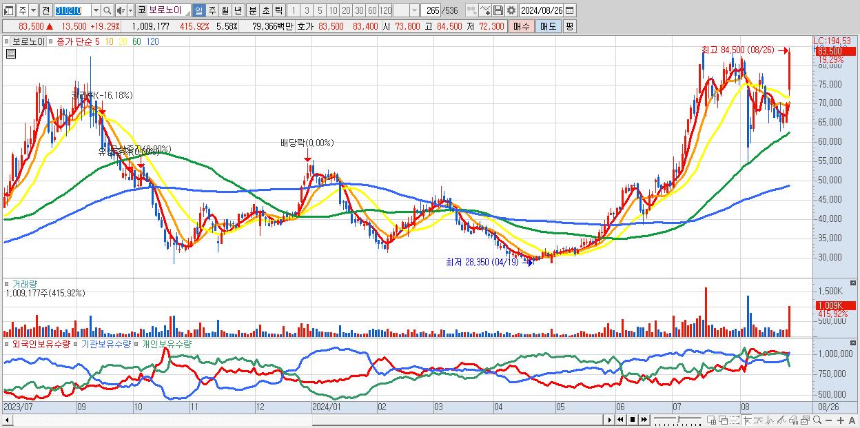 - 보로노이 (83,500원 ▲ 19.29% , 시총: 15,108억, 거래량: 1,009,177, 거래대금:794억)