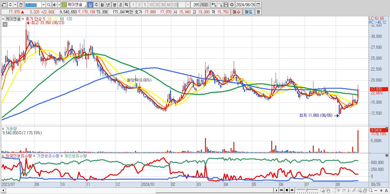 - 케이엔솔 (17,970원 ▲ 22.66% , 시총: 2,336억, 거래량: 9,540,650, 거래대금:1,710억)