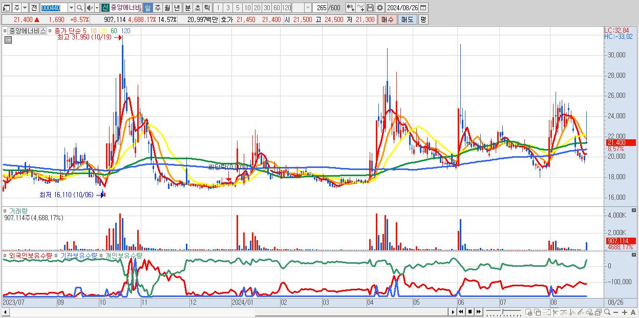 - 중앙에너비스 (21,400원 ▲ 8.57% , 시총: 1,333억, 거래량: 907,114, 거래대금:210억)