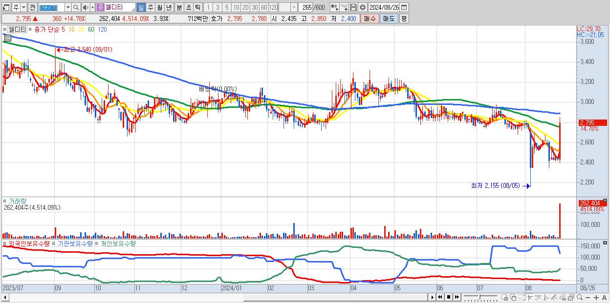 - 엘디티 (2,795원 ▲ 14.78% , 시총: 187억, 거래량: 262,404, 거래대금:7억)