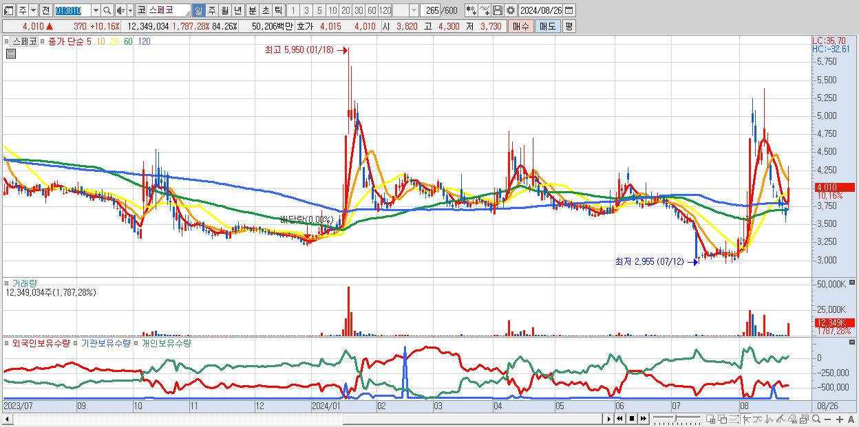 - 스페코 (4,010원 ▲ 10.16% , 시총: 588억, 거래량: 12,349,034, 거래대금:502억)