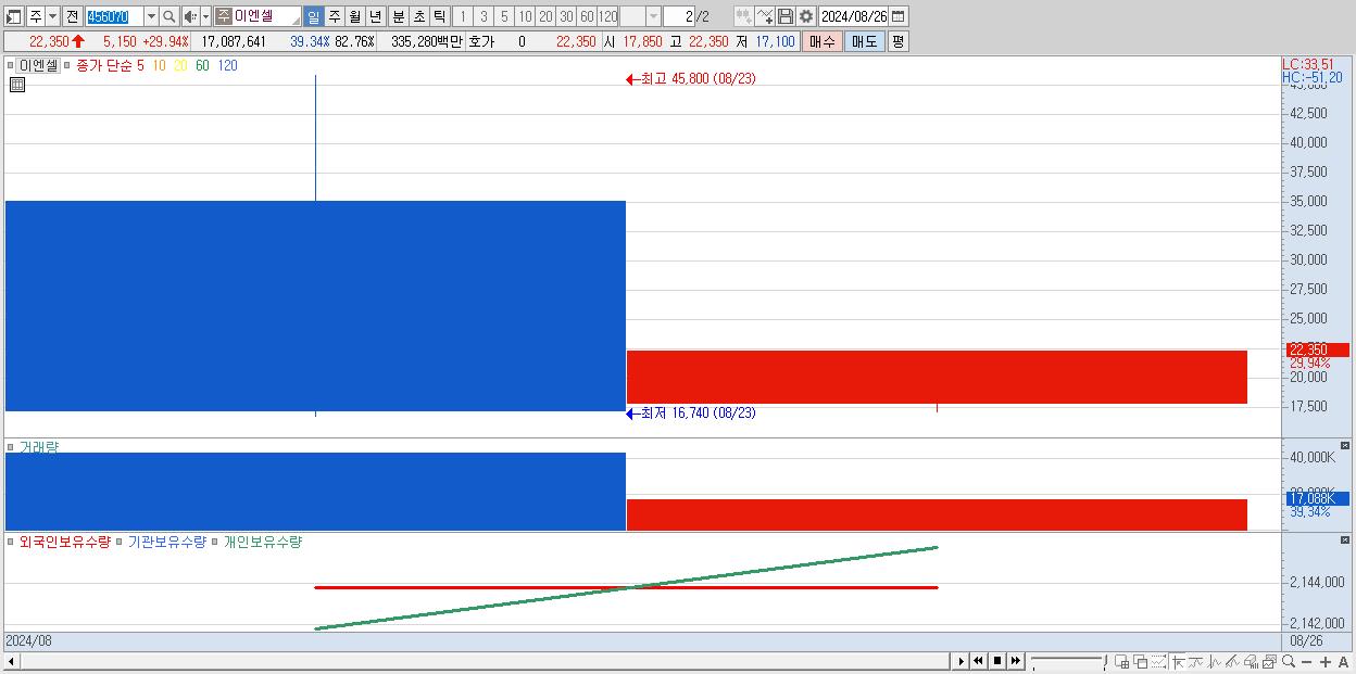 - 이엔셀 (22,350원 ▲ 29.94% , 시총: 2,090억, 거래량: 17,087,641, 거래대금:3,353억)