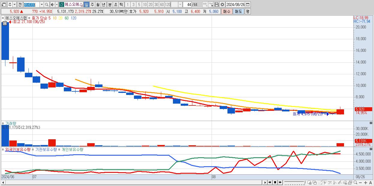 - 에스오에스랩 (5,920원 ▲ 14.95% , 시총: 1,038억, 거래량: 5,131,173, 거래대금:305억)