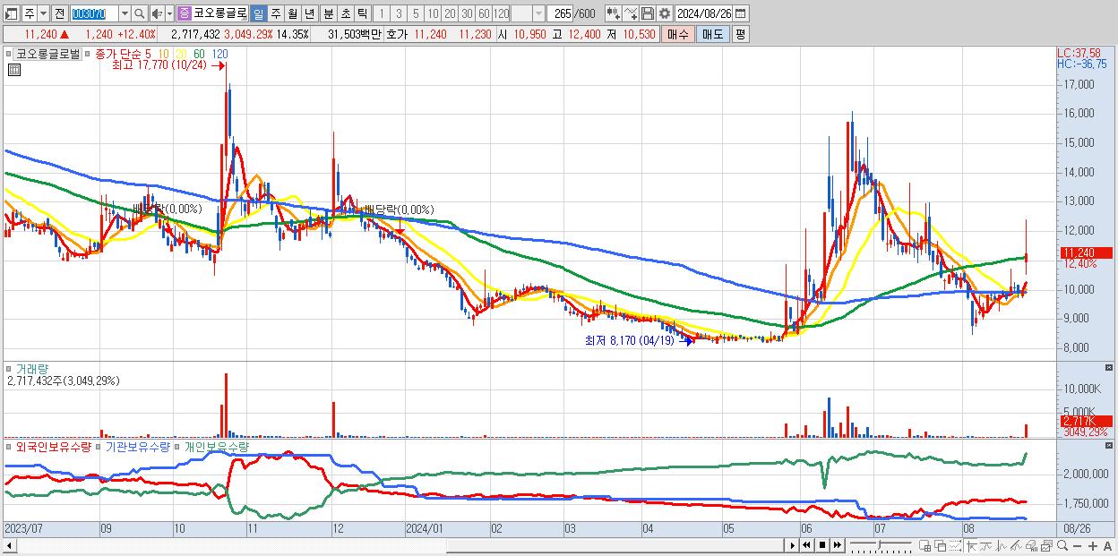 - 코오롱글로벌 (11,240원 ▲ 12.4% , 시총: 2,128억, 거래량: 2,717,432, 거래대금:315억)