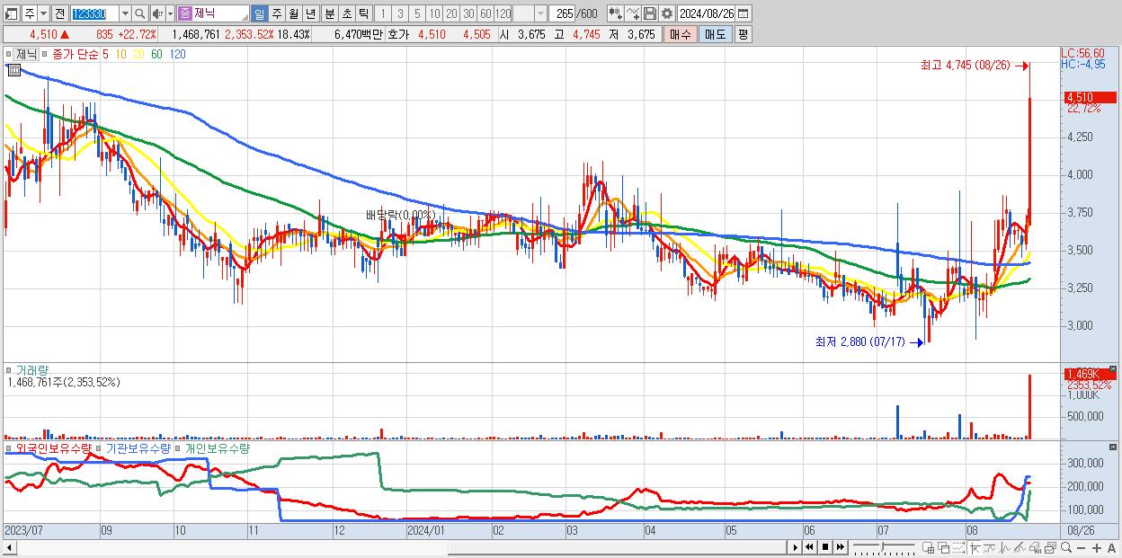 - 제닉 (4,510원 ▲ 22.72% , 시총: 359억, 거래량: 1,468,761, 거래대금:65억)