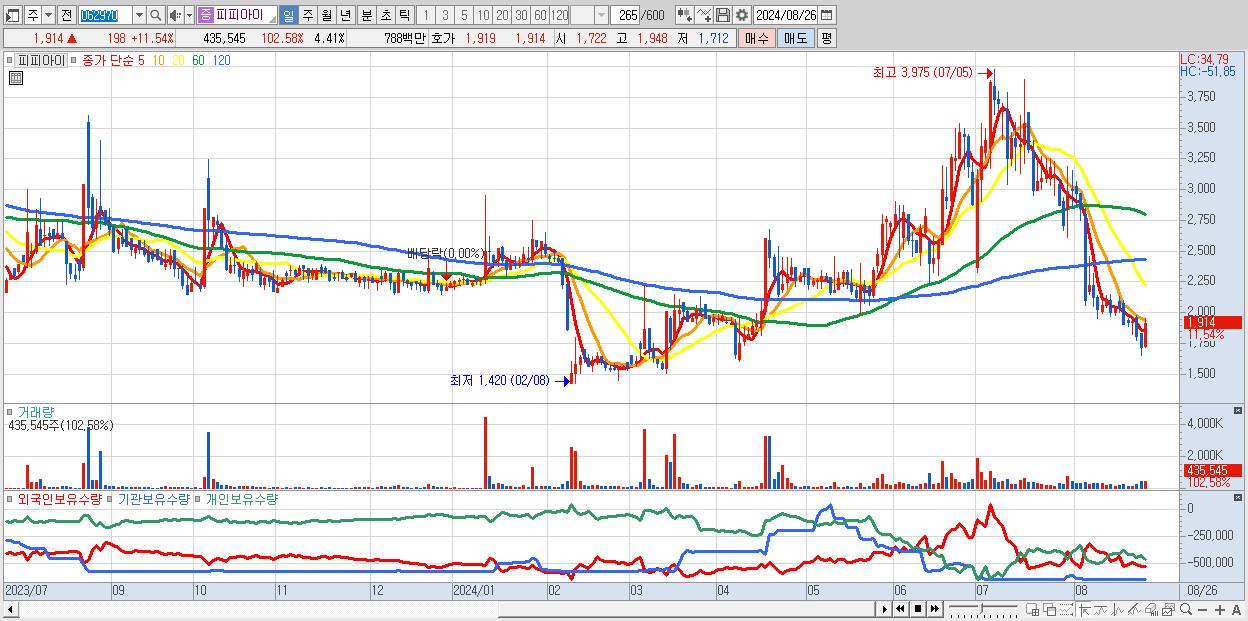 - 피피아이 (1,914원 ▲ 11.54% , 시총: 189억, 거래량: 435,545, 거래대금:8억)