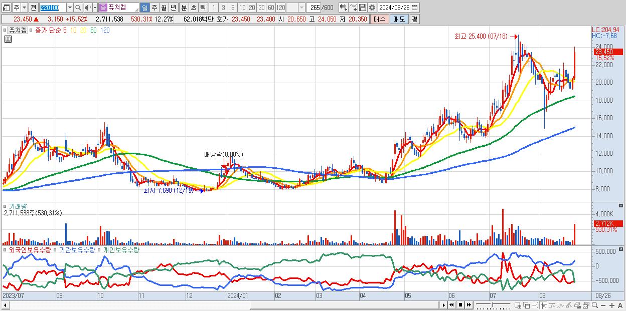 - 퓨쳐켐 (23,450원 ▲ 15.52% , 시총: 5,183억, 외국인 순매수 거래금:65억)