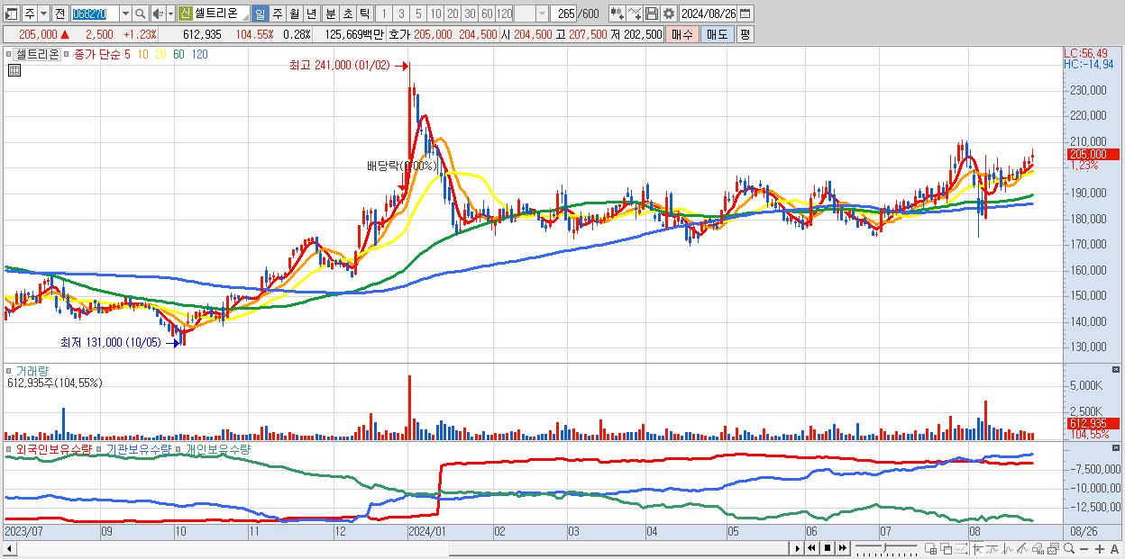 - 셀트리온 (205,000원 ▲ 1.23% , 시총: 444,893억, 외국인 순매수 거래금:62억)
