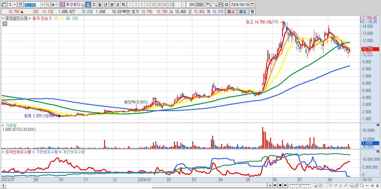 - 중앙첨단소재 (10,790원 ▲ 3.15% , 시총: 10,772억, 외국인 순매수 거래금:36억)