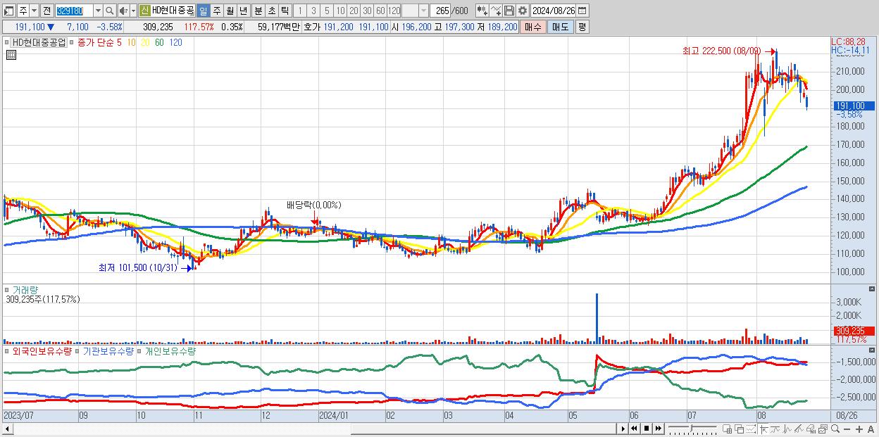 - HD현대중공업 (191,100원 ▼ -3.58% , 시총: 169,645억, 외국인 순매수 거래금:72억)