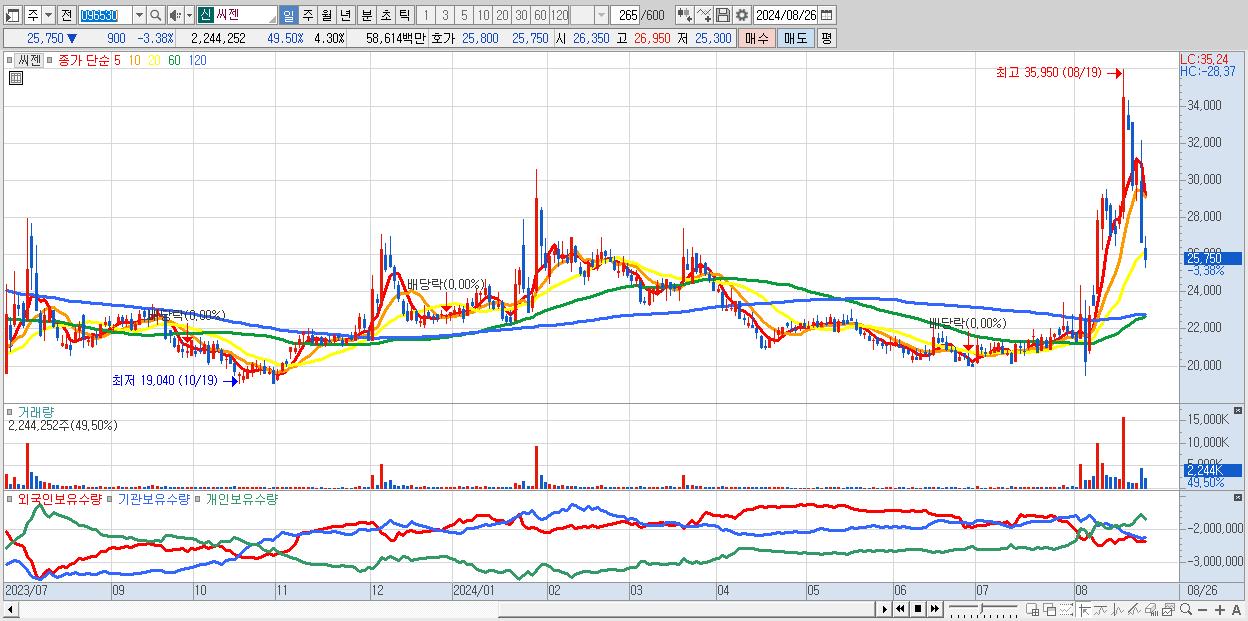 - 씨젠 (25,750원 ▼ -3.38% , 시총: 13,448억, 외국인 순매수 거래금:43억)