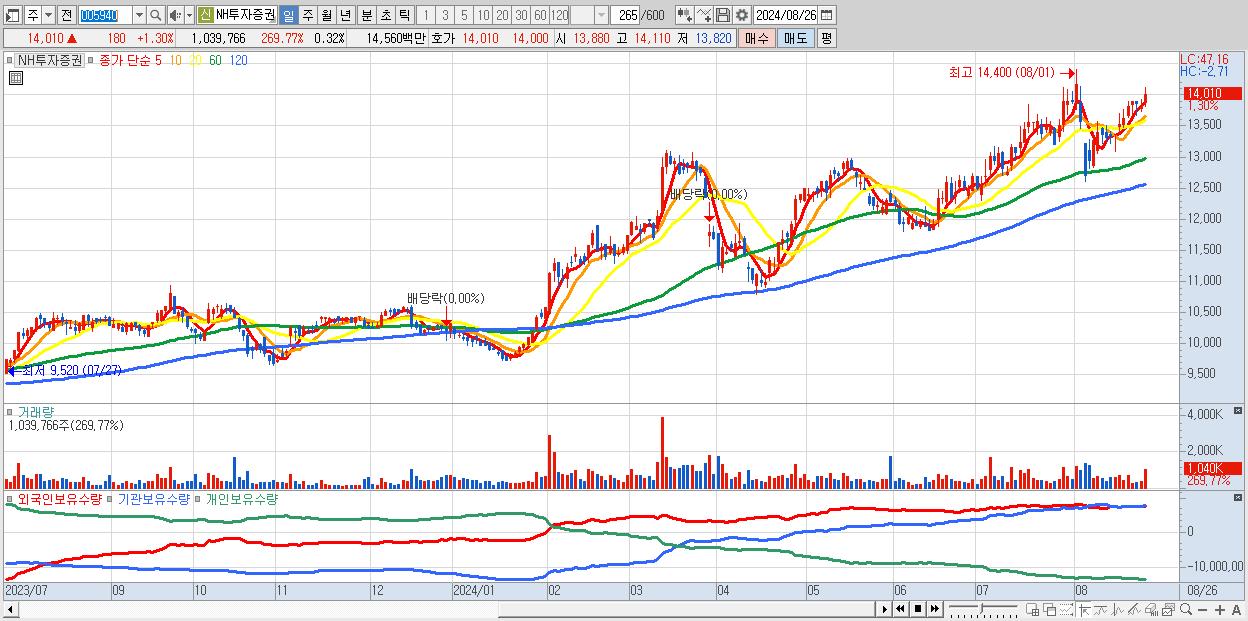 - NH투자증권 (14,010원 ▲ 1.3% , 시총: 45,882억, 외국인 순매수 거래금:39억)