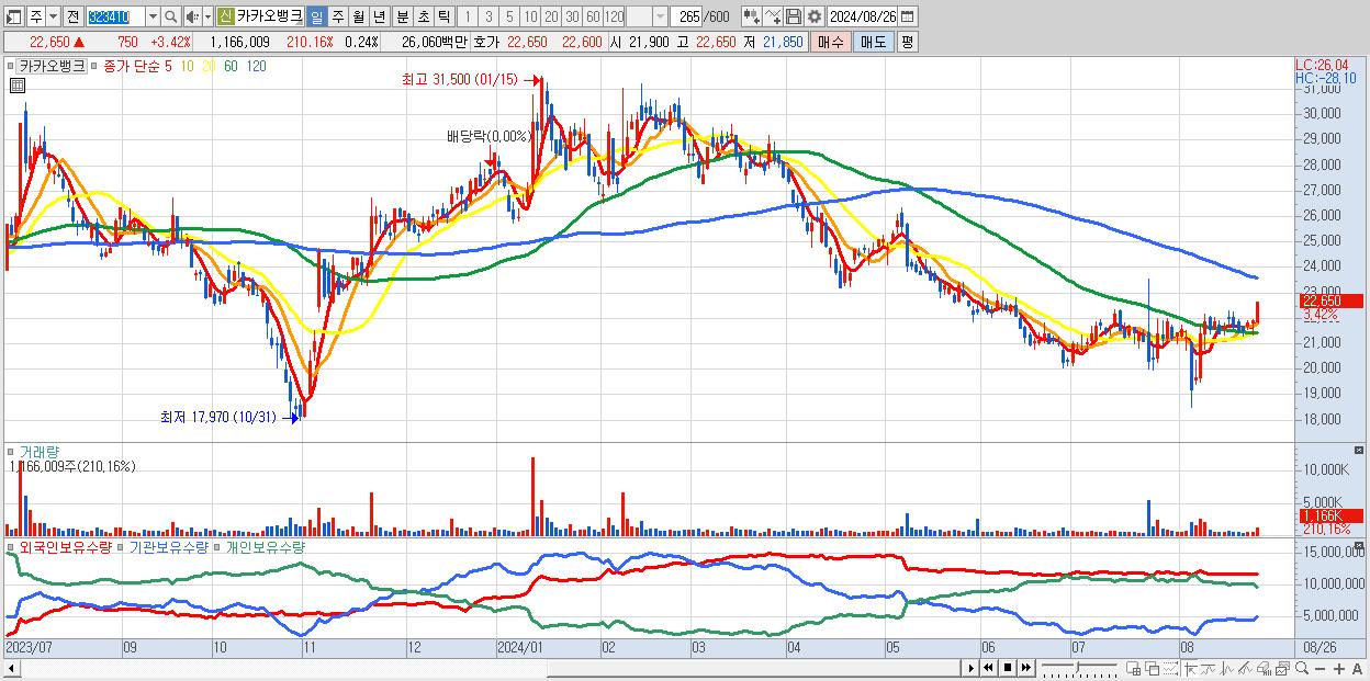 - 카카오뱅크 (22,650원 ▲ 3.42% , 시총: 108,024억, 외국인 순매수 거래금:50억)