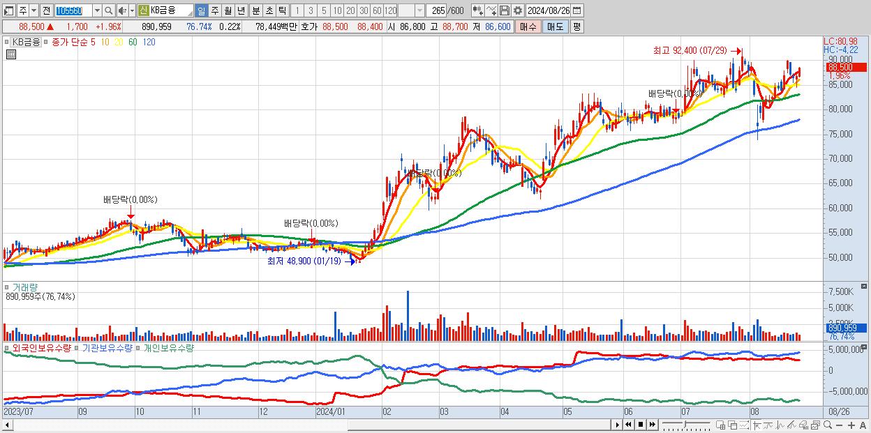 - KB금융 (88,500원 ▲ 1.96% , 시총: 357,107억, 외국인 순매수 거래금:94억)