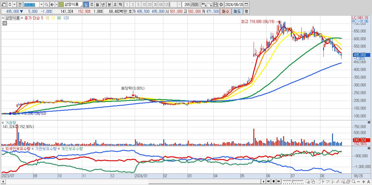 - 삼양식품 (495,000원 ▼ -1% , 시총: 37,288억, 외국인 순매수 거래금:77억)