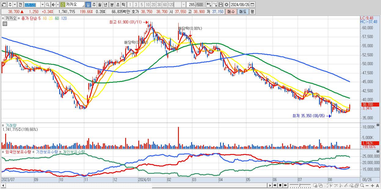 - 카카오 (38,700원 ▲ 3.34% , 시총: 171,631억, 외국인 순매수 거래금:71억)