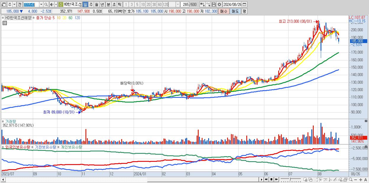 - HD한국조선해양 (185,000원 ▼ -2.53% , 시총: 130,930억, 외국인 순매수 거래금:187억)