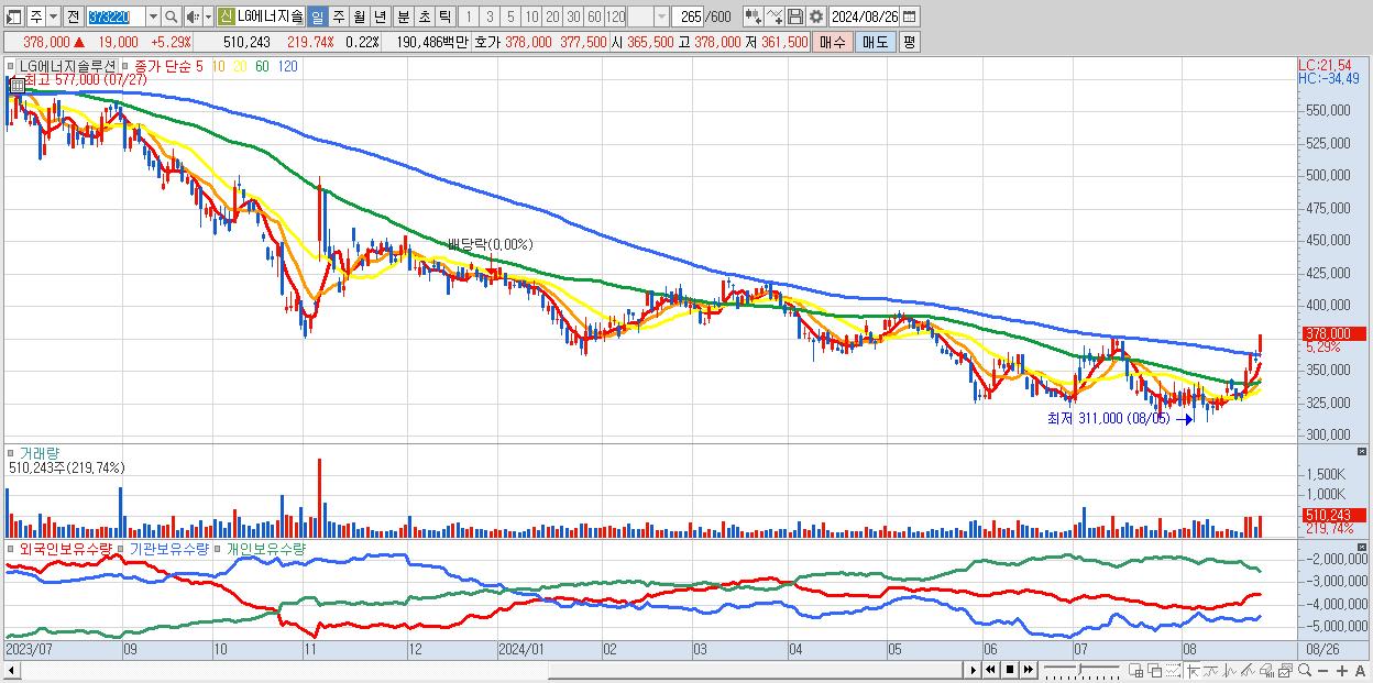 - LG에너지솔루션 (378,000원 ▲ 5.29% , 시총: 884,520억, 외국인 순매수 거래금:341억)