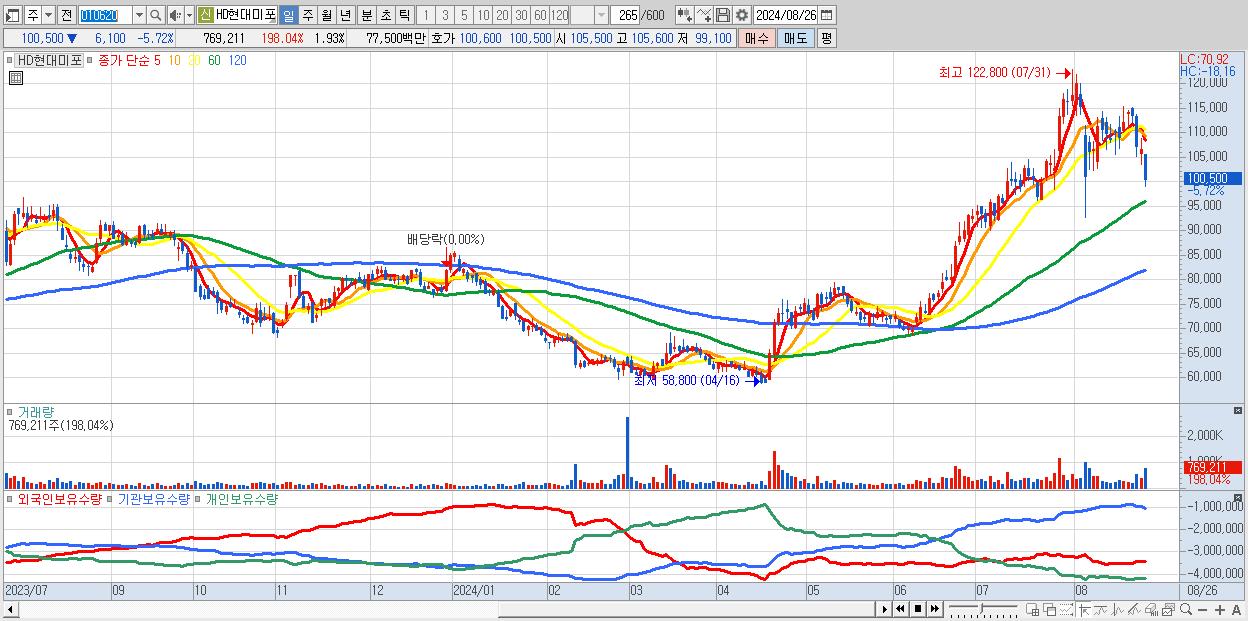- HD현대미포 (100,500원 ▼ -5.72% , 시총: 40,142억, 외국인 순매수 거래금:129억)