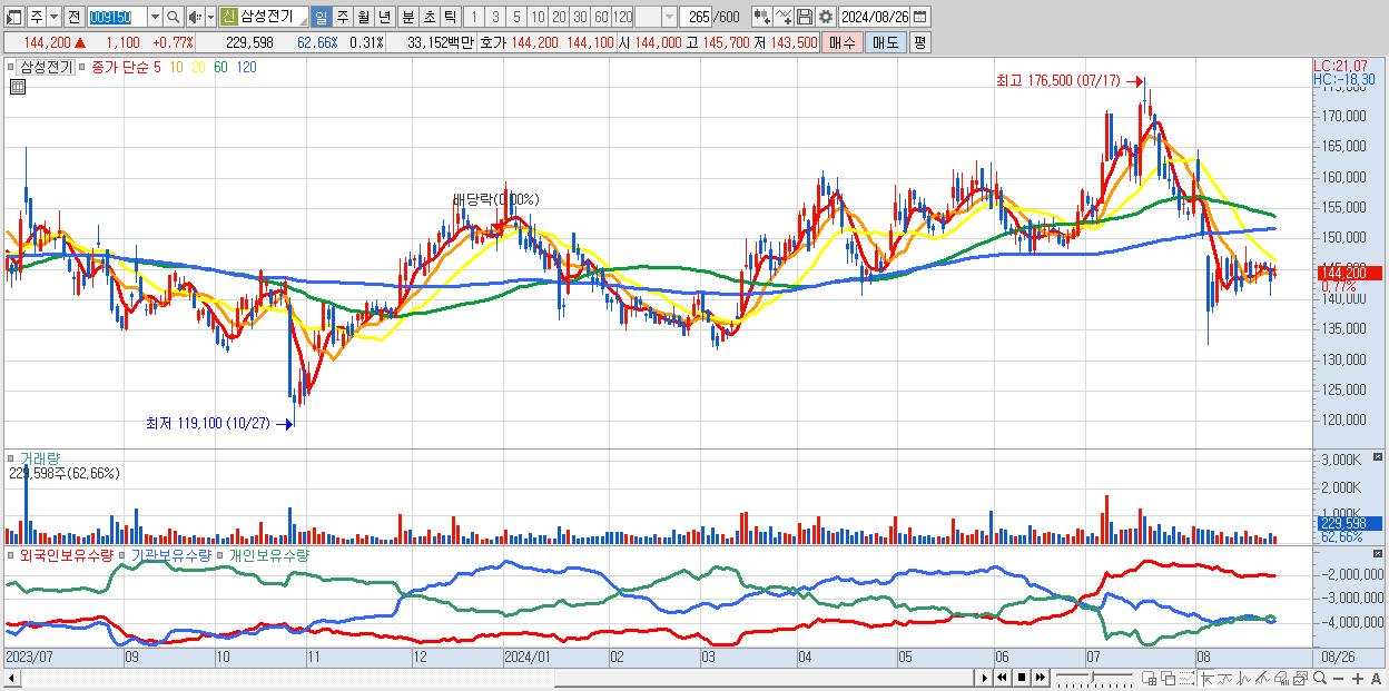 - 삼성전기 (144,200원 ▲ 0.77% , 시총: 107,708억, 외국인 순매수 거래금:55억)