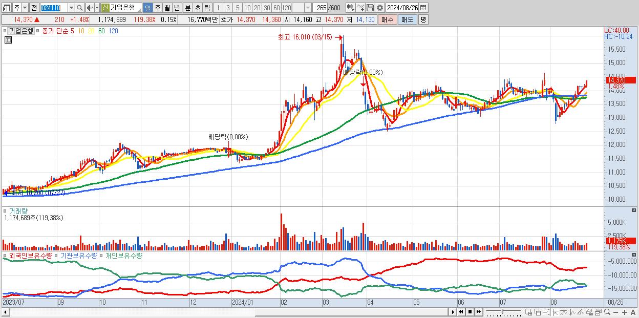 - 기업은행 (14,370원 ▲ 1.48% , 시총: 114,590억, 외국인 순매수 거래금:51억)