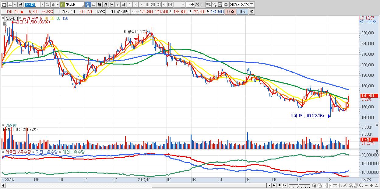 - NAVER (170,700원 ▲ 3.52% , 시총: 274,459억, 외국인 순매수 거래금:363억)